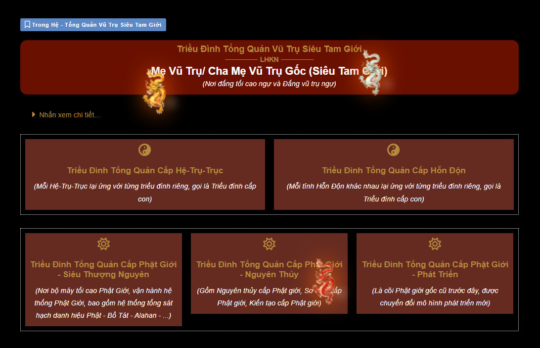 Bên trên là bộ máy các Triều Đình Tổng Quản (Cấp tổng). Từng Hệ-Trụ-Trục, từng cõi giới, từng cảnh trời, từng tầng trời lại tương ứng với các Triều Đình Cấp Dưới (Cấp con). Hết thẩy với số lượng ước tính hơn 100 triều đình lớn nhỏ khác nhau (đã bao gồm cõi nhân gian). Do đó, bài viết này tôi chỉ liệt kê danh sách cấp tổng để bạn dễ hình dung và dễ đối chiếu với sách vở – kiến thức có sẳn.