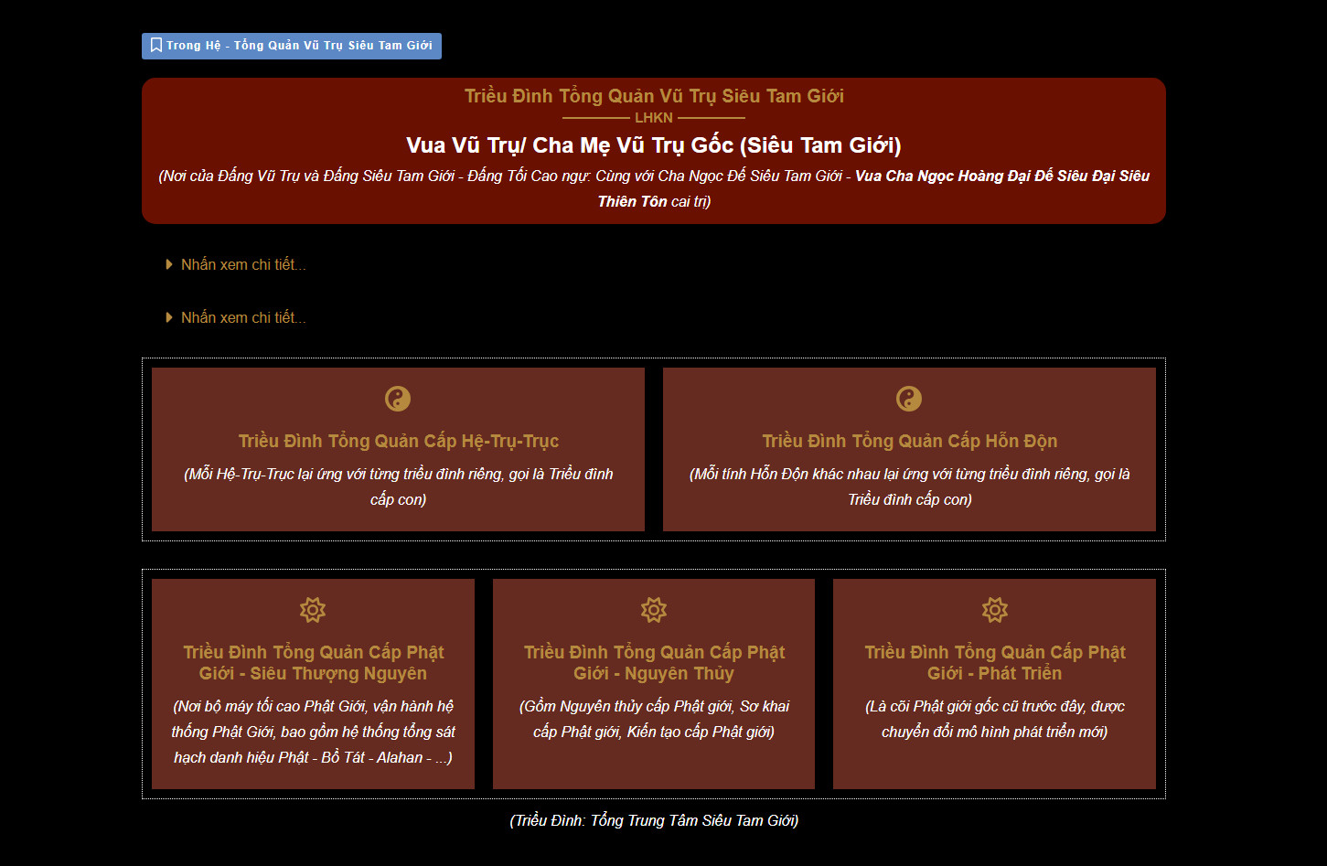 Bên trên là bộ máy các Triều Đình Tổng Quản (Cấp tổng). Từng Hệ-Trụ-Trục, từng cõi giới, từng cảnh trời, từng tầng trời lại tương ứng với các Triều Đình Cấp Dưới (Cấp con). Hết thẩy với số lượng ước tính hơn 100 triều đình lớn nhỏ khác nhau (đã bao gồm cõi nhân gian). Do đó, bài viết này tôi chỉ liệt kê danh sách cấp tổng để bạn dễ hình dung và dễ đối chiếu với sách vở – kiến thức có sẳn.